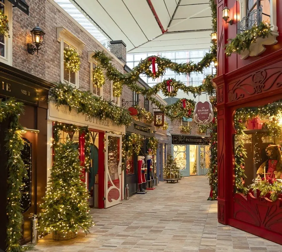 首先,我們將前往【現代百貨首爾店】,這裡有一個名為“哈利的夢幻商店 (La boutique d’Harry)”的特色聖誕村。位於5樓的“音韻森林”空間,被轉化成一個名為“H Village”的聖誕村,充滿了歐洲風情。整個村落中心有一棵高達11公尺的聖誕樹,點綴著超過6,000個燈泡,創造出溫馨明亮的氛圍。故事圍繞一位老人在品嚐了名為哈利的小熊製作的馬卡龍和熱紅酒後,夢見了久違的家人,並由此靈感創建了“哈利的夢幻商店”。這裡共有16家商店,陳列著聖誕裝飾、明信片、馬克杯和音樂盒等商品。參觀此處需要通過Naver預約,或者現場通過掃描QR碼進行登記候位。