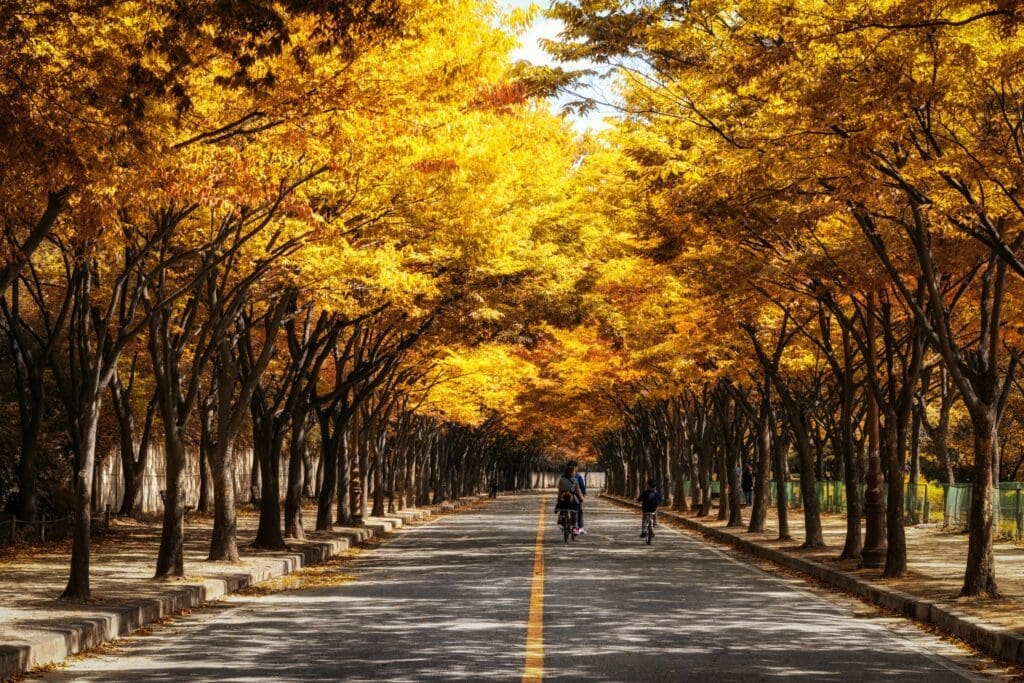 前往江原道的洪川縣,探索洪川銀杏林。這裡有約2000棵銀杏樹一字排開,落葉時形成的金黃色景象令人驚歎。洪川銀杏林原本是不對外開放的私人森林,但如今已經在十月對外開放一個月。附近還有其他觀光景點,是秋季一日遊的好去處。