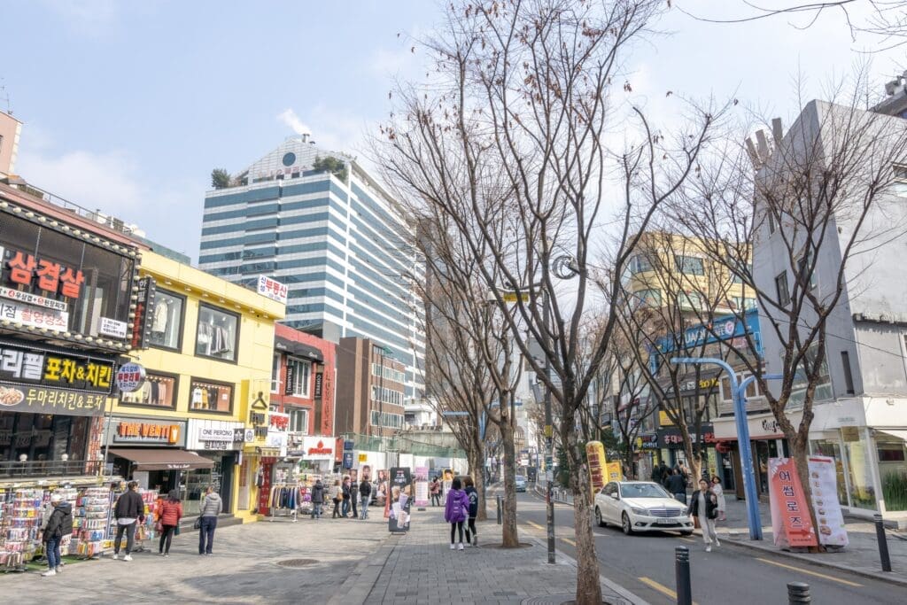 - 弘大入口站街區:從弘益大學1號門步行至入口站附近,可以發現許多時尚的服裝店、手搖飲料店、咖啡店和餐廳。這個地區也有許多流行文化相關的店鋪,如漫畫書店和唱片店。