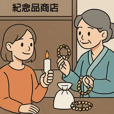 在入口處的紀念品商店,你可以買到白米、白色蠟燭或生肖造型蠟燭,還有各式能量手鍊。購買後,可以在門口寫上自己的名字與願望。