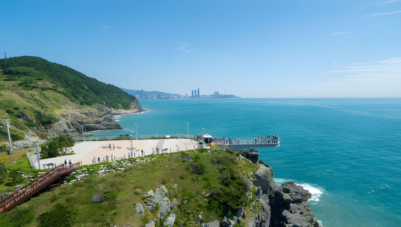 五六島位於釜山南端,由海蝕地形形成的奇岩景觀,因潮汐變化而有五或六座小島而得名。Skywalk 以透明玻璃步道延伸至海上,行走其上可俯瞰碧藍大海與驚濤拍岸,十分刺激。這裡不僅是熱門拍照打卡點,也能欣賞日出與日落的迷人景致。