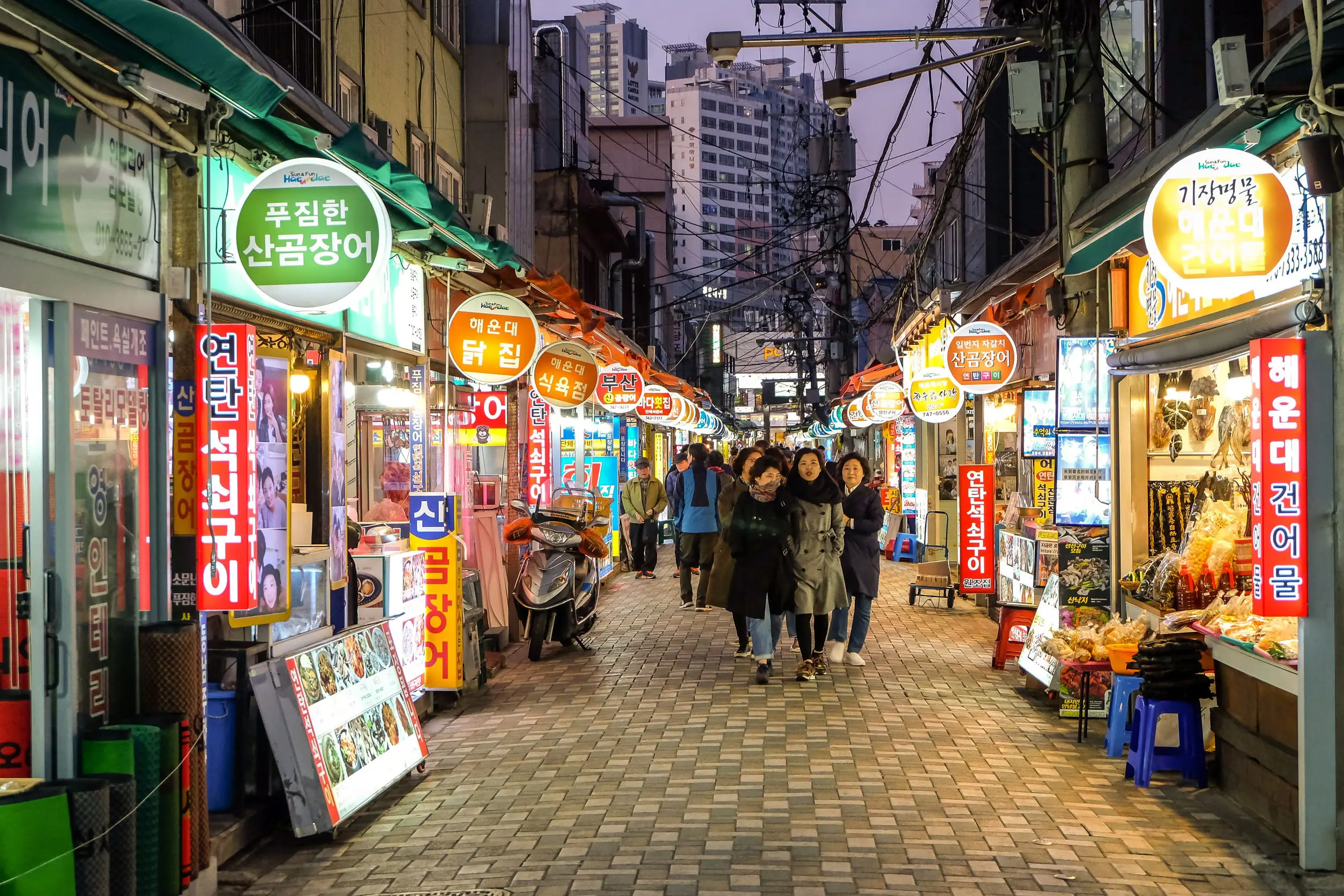 近釜山著名海灘的在地市場,融合傳統與現代小吃文化。市場內販售各式韓國地道美食如辣炒年糕、紫菜飯捲、海鮮煎餅等,價格實惠又具人情味。漫步其中,不僅能享受味蕾,也能感受在地生活的真實溫度。
