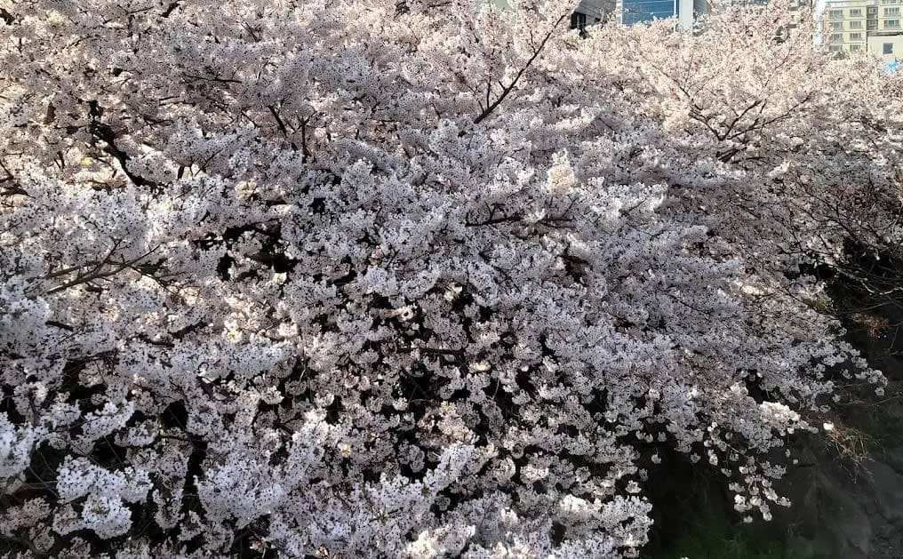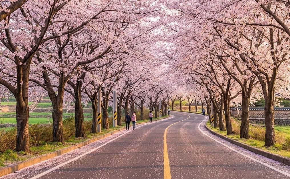 長田里櫻花隧道也是濟州賞櫻不可錯過的景點之一,這裡兩旁大多是農田,放眼望去多了點清新寧靜的感覺,走起來也更為舒適。道路兩旁高大且密集的櫻花樹也將此處打造為一條粉白色的夢幻隧道,每每陣風吹來,捲起櫻雪的瞬間,彷彿置身於韓劇場景般浪漫。