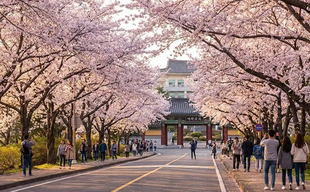 濟州大學的校園各處種植了不同櫻花樹,校園內有綿延一公里的櫻花公路,在濃厚的書香氣息映襯下感受陣陣花香,在粉紅色的海洋中漫步,欣賞櫻花別有一番味道。每逢春天校區前的車道便會開滿櫻花,形成一條壯觀的櫻花走廊,大多數的民衆都是爲了這條美麗的櫻花走廊慕名而來。