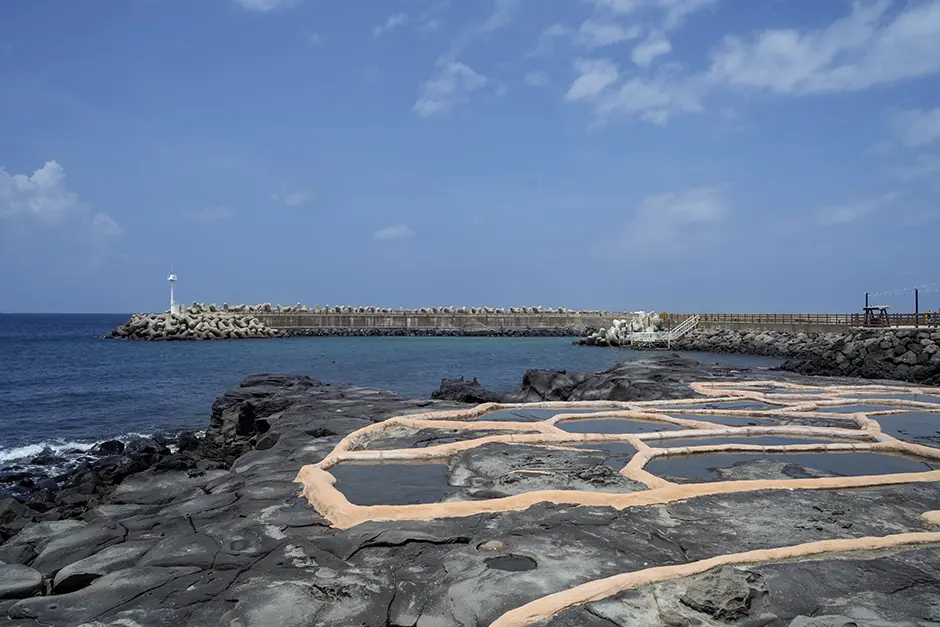 舊嚴浦口旁邊就是能夠細細觀察濟州早期生活樣貌的「石鹽田」,舊嚴里的「石鹽田」是在廣闊的玄武岩上生產海鹽的地方,舊嚴里居民利用這樣的天然岩盤地帶生產鹽。而「石鹽田」 的海岸道路獲選為韓國美麗海岸道路,舊嚴浦口的另一邊有座石製燈塔,是用來照亮漁夫們深夜回家之路的燈塔。玄武岩板上的岩田與石燈塔都是僅在濟州才能看到的重要海洋文化遺產。