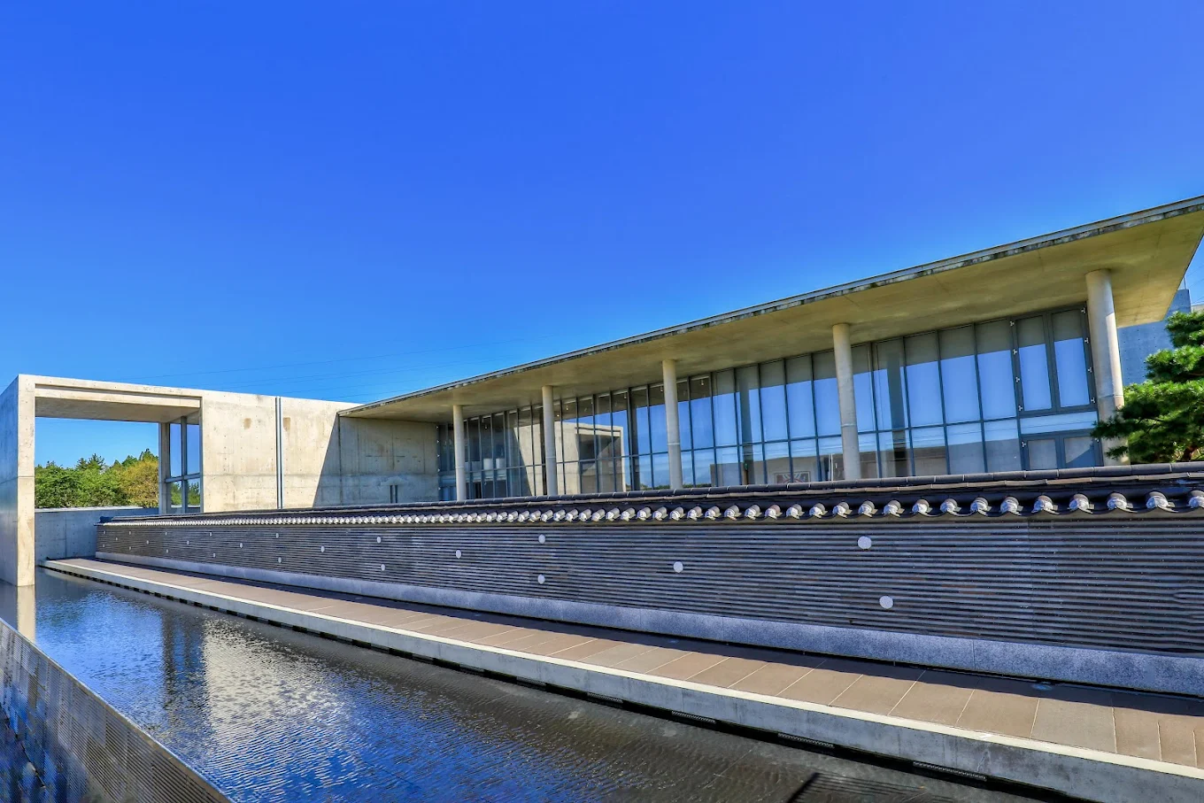 濟州島的本態博物館由安藤忠雄設計,採用他熟悉的裸露混凝土語彙。建築由5個展廳與中庭組成,整體呈現簡潔的幾何形體,動線從入口開始逐層展開,引導參觀者沿著光線與空間的節奏行進。天窗和狹長縫隙將自然光引入室內,光線沿混凝土牆面滑動,形成層次分明的光影效果;中庭與展廳之間的水景則引入流動感,柔化混凝土的冷硬感,並營造沉靜而充滿生命力的氛圍。