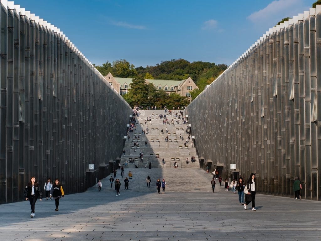 1886年由美國監理會傳教士Mary Scranton女士設立的梨花女子大學,為韓國第一間女子大學,也是最有名的女子大學,屬於古典、壯麗的歐風建築校園。梨花女大更是韓國旅遊當中,最多人踩點的大學校園。梨花女子大學最早名為「梨花學堂」,是1887年由明成皇后(1854~1895)所賜名。校內的一座基督教教堂,現在改做大禮堂之用,是校內極具代表性的建築之一。校園裡最美打卡點,是由法國建築家多米尼克‧佩羅設計的地下校園複合園區ECC(Ewha Campus Complex)為代表地標。峽谷型的建築設計塑造出不少休憩空間予學生們互相交流。大樓兩側屋頂是綠地公園,而下方則是教室,採用透光設計讓自然光照射到大樓的每一個角落,設計既環保又更顯現代化。