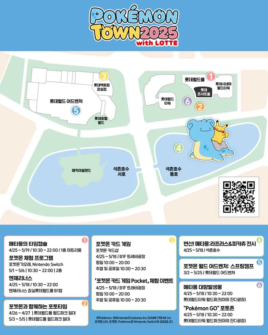 韓國首爾松坡區廳再度與Pokémon主辦方合作,Pokémon Town強勢回歸~去年拉普拉斯和皮卡丘受到許多訓練家的歡迎,聽到好消息的百變怪非常羨慕,它變身為拉普拉斯和皮卡丘的樣子來到「2025 Pokémon Town」與大家同樂。4月25日至5月18日,在蠶室樂天世界、樂天世界購物中心、樂天世界塔、石村湖周邊一帶舉辦一系列的活動,快跟寶可夢們踏上寶可夢大師的旅程。