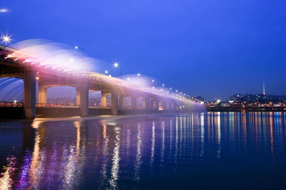 夜晚的漢江公園化身成為音樂與水舞的劇場,噴泉隨音樂律動,搭配燈光效果,讓人沉醉在浪漫氛圍中。