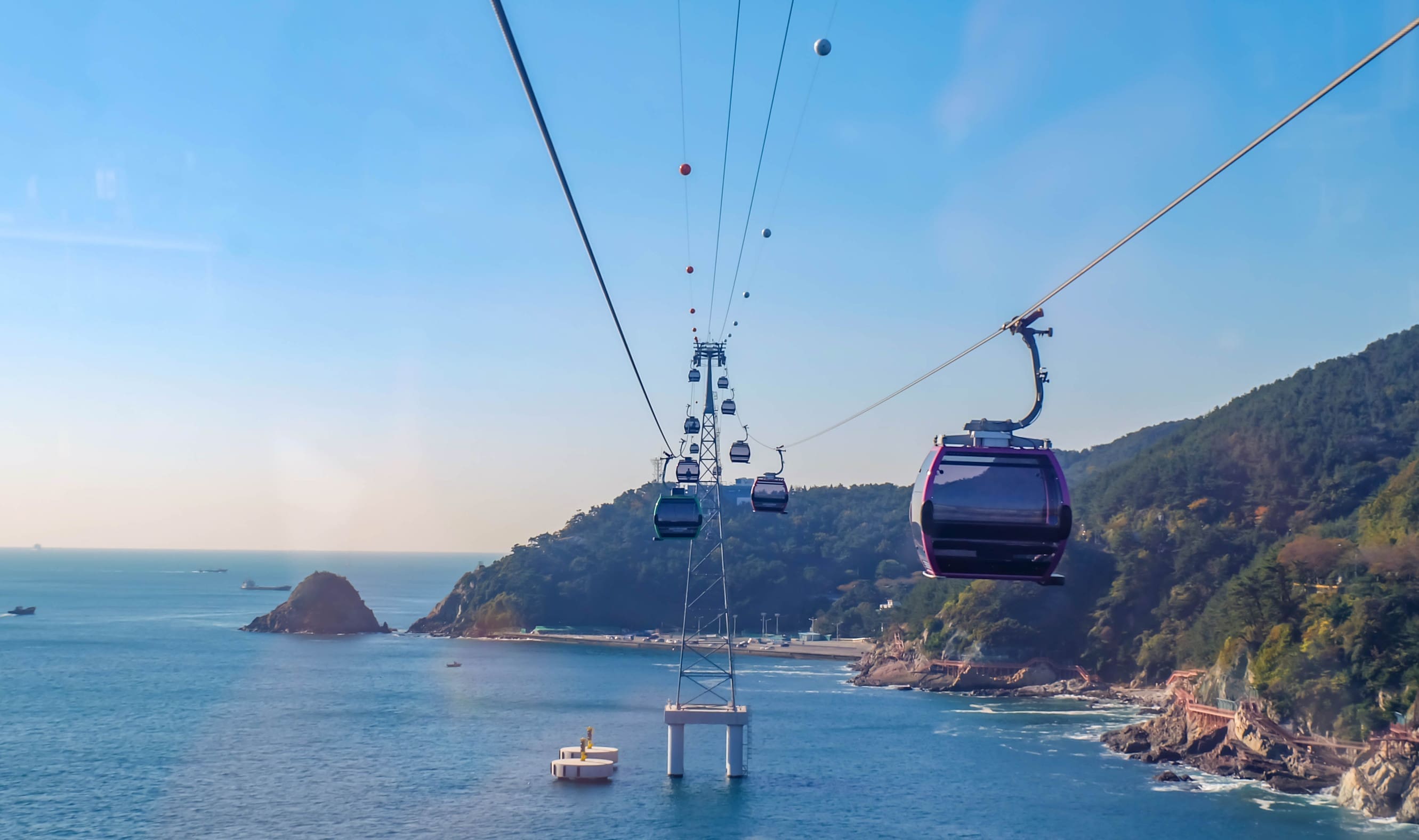 從松島海水浴場橫越釜山港灣,全長 1.62 公里,連接松林公園與龜島站。高空中可飽覽城市天際線與海景交織的壯麗畫面,夜晚更可欣賞燈火與海面倒影交錯的浪漫景致。